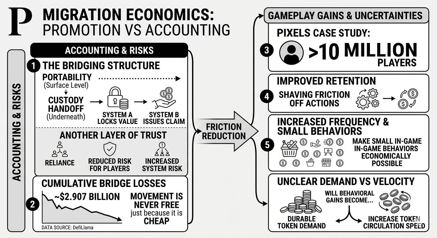 That is where migration economics stop being promotional and start becoming accounting. A bridge looks like portability on the surface. Underneath, it is a custody handoff: one system locks value, another issues a claim to it somewhere else. That structure enables lower-friction gameplay and chain-specific incentives, but it also creates another layer where trust has to hold. DefiLlama’s exploits database puts cumulative bridge losses across crypto at about $2.907 billion, which is a useful reminder that movement is never free just because it is cheap.
