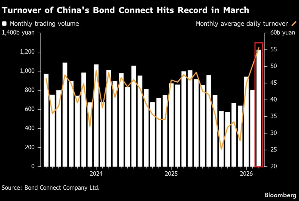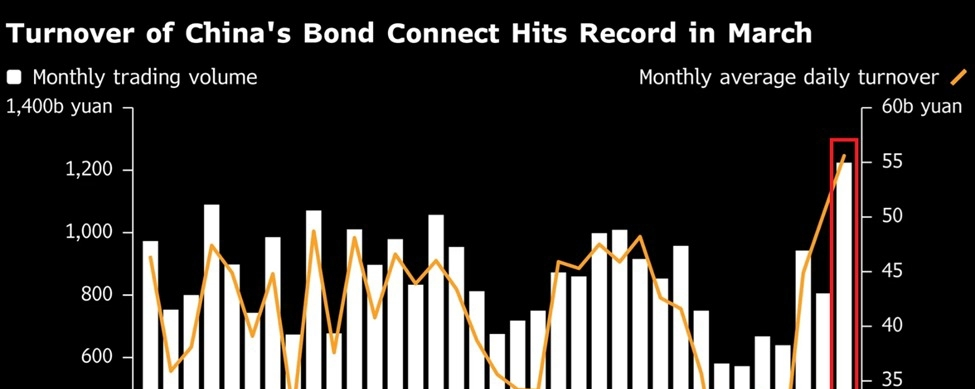 $179 miliardów rekord: Wolumen obrotu chińskimi obligacjami krajowymi przez zagraniczne fundusze wzrósł do rekordowego poziomu $179 miliardów w marcu.
