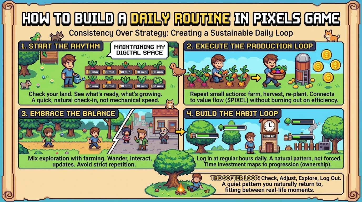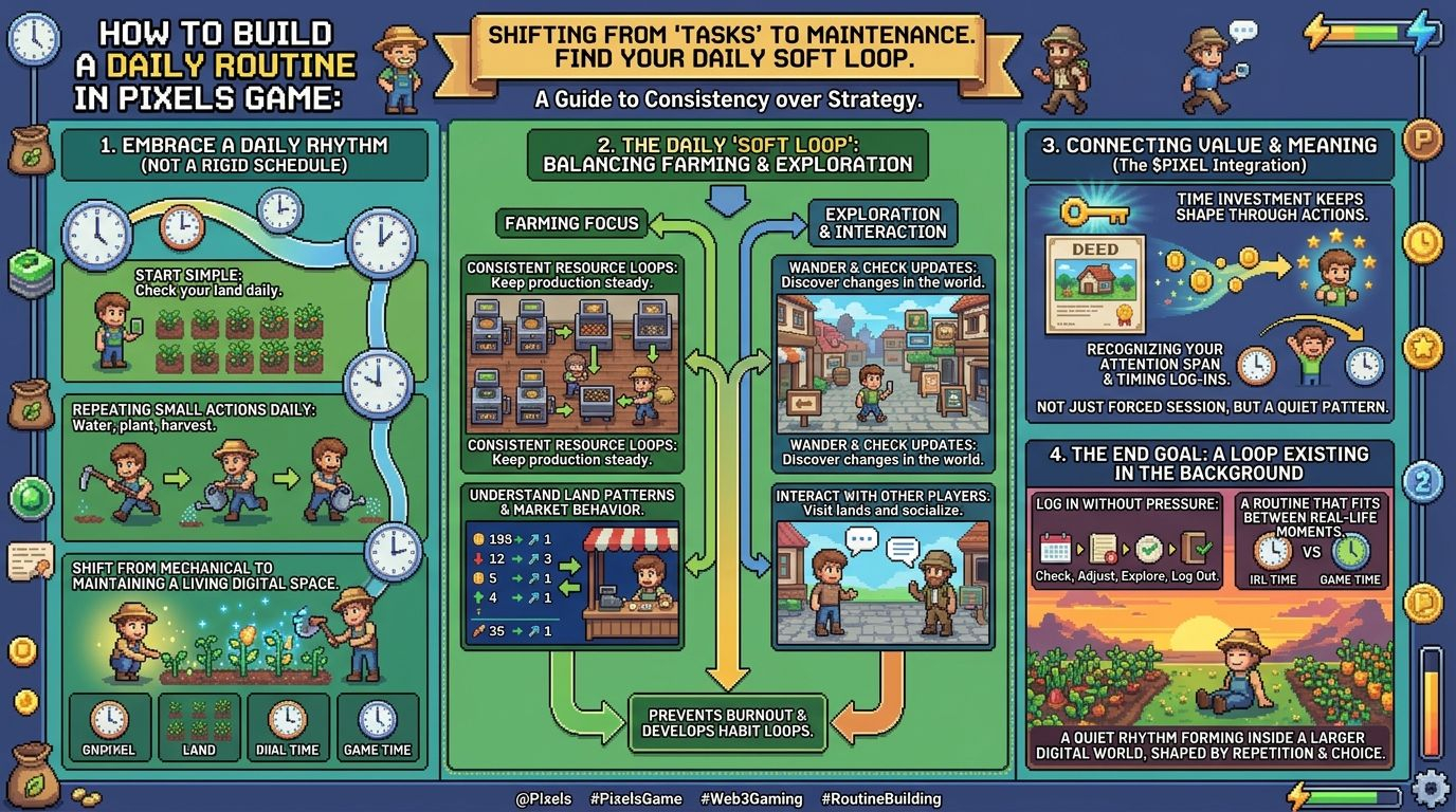 Maybe that’s what a good routine inside #Pixels ends up being. Not a strict schedule, but a quiet pattern you naturally return to. Something that fits between real life moments instead of competing with them.