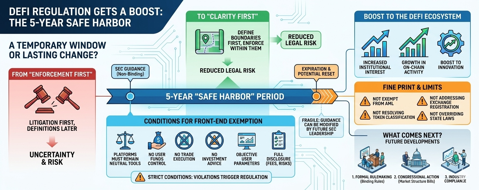 The U.S. SEC’s latest guidance marks one of the most significant regulatory developments for DeFi in recent years. By introducing a conditional exemption for front-end interfaces and a five-year “safe harbor,” regulators are signaling a shift toward clearer, more innovation-friendly rules. But beneath the optimism lies an important question: is this a lasting transformation or just a temporary window?