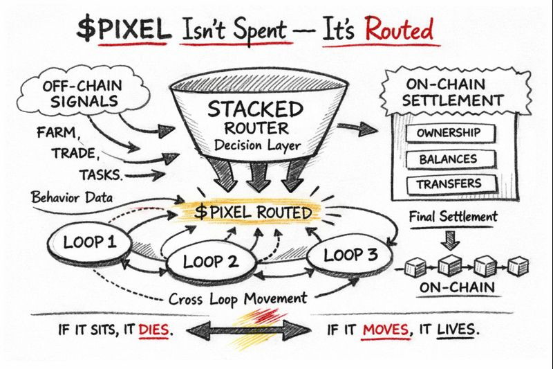 Everything final still settles on-chain ownership, balances, transfers. But by the time $PIXEL moves there, its path has already been shaped.