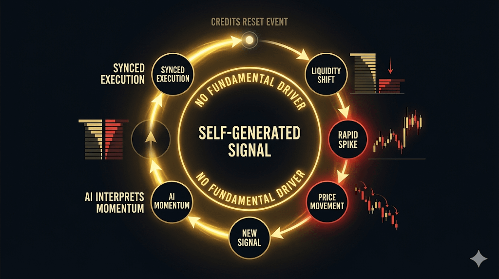 Nie dlatego, że rynek ma fundamentalne powody. Nie dlatego, że są jakieś wiadomości. Tylko dlatego, że jedna grupa kont kończy kredyty w tym samym czasie, używając tej samej maszyny rozumującej, odczytując ten sygnał w ten sam sposób, a następnie tworząc ten sam sygnał, który śledzą.