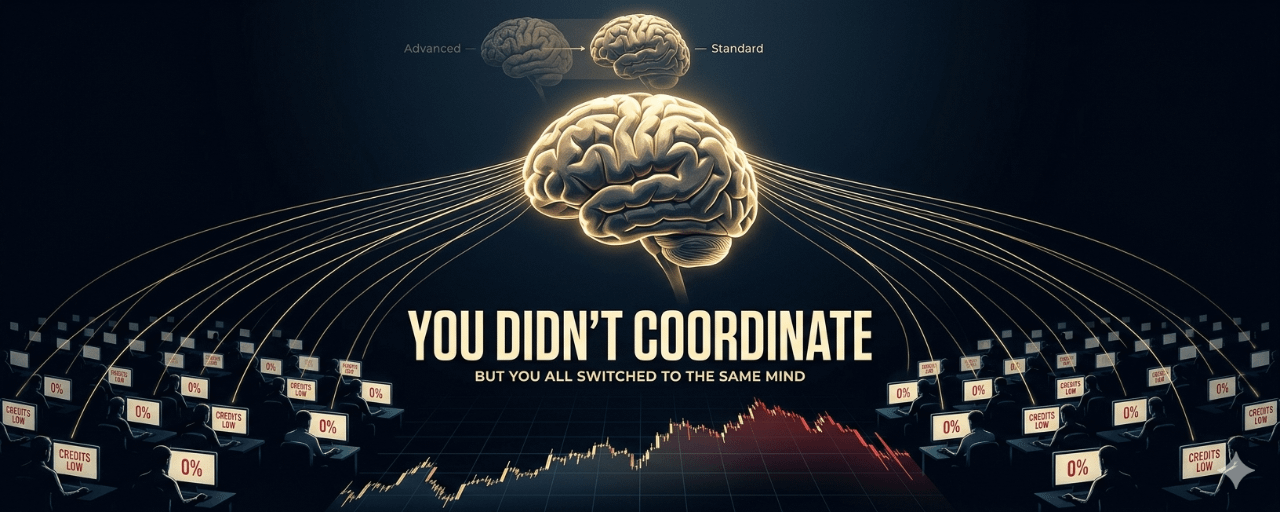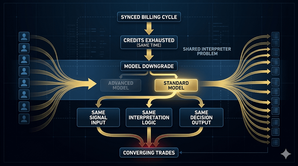 A gdy wystarczająco dużo kont przechodzi do tego samego modelu, odbierając ten sam sygnał rynkowy, zaczynają odczytywać ten sygnał w ten sam sposób. Nie dlatego, że ich strategie są podobne. Ale dlatego, że ich maszyny rozumujące po downgrade interpretują to w ten sam sposób. Problem wspólnej interpretacji — nie dlatego, że ktoś wybiera podobnie, ale dlatego, że nikt nie wie, że używają tej samej inteligencji.