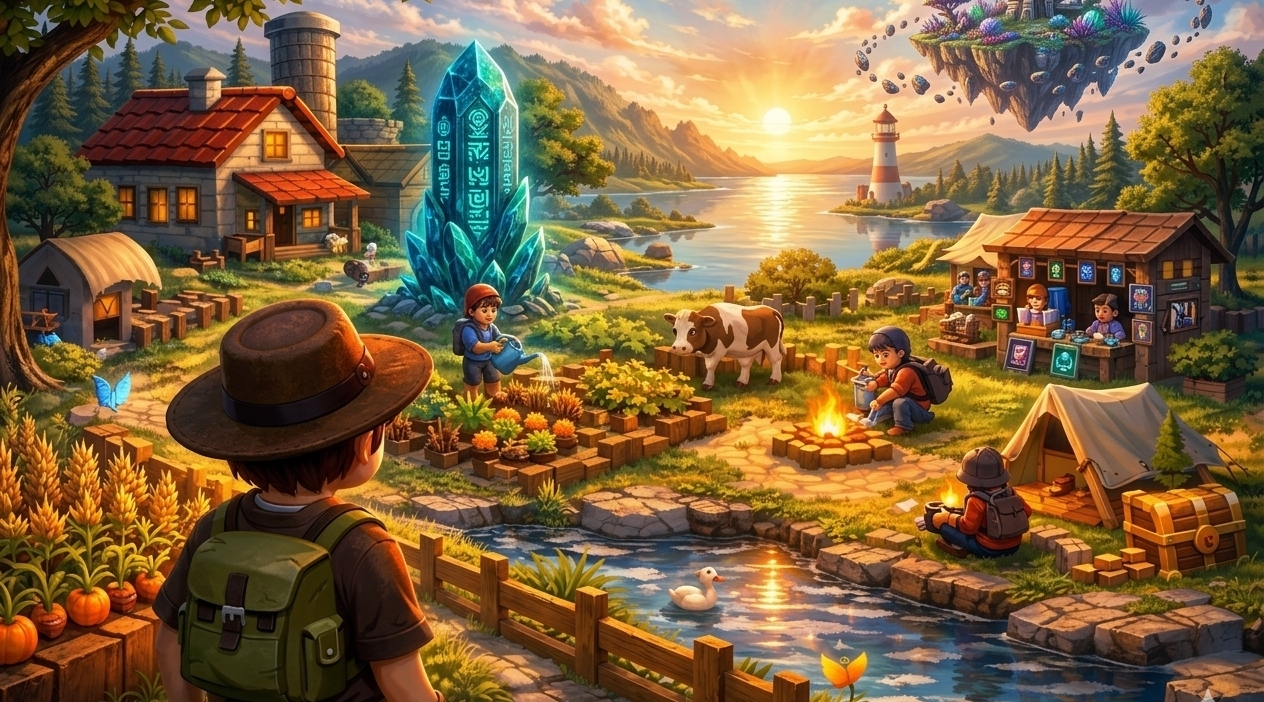 I’m watching this idea of a Web3 game where you farm, explore, build stuff, meet people… and it doesn’t immediately feel loud or stressful. That’s what stands out first. Not hype. Not pressure. Just a kind of slow open space.I like that more than I expected.