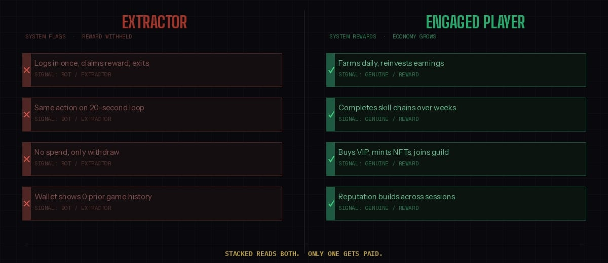 Getting that ratio above one required the Pixels team to build something that most game studios do not have: a system that knows the difference between a player who crafted a complex item chain, reached a skill milestone, and logged in consistently for three weeks, versus a player who opened the app once to claim a daily bonus. Both players exist inside the same game. Both technically qualify for rewards under a naive distribution model. But only one of them is the kind of player the economy needs more of, and only one of them benefits from the kind of reward that compounds their engagement.
