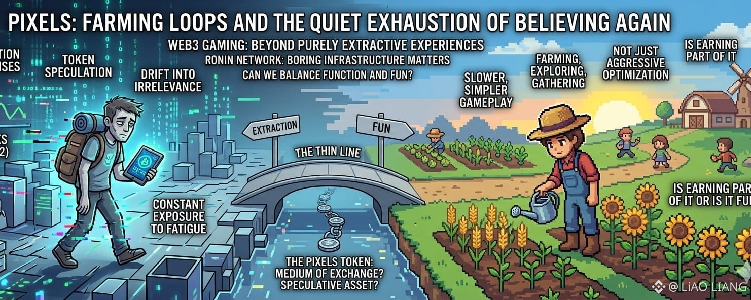 Bo problem, który próbuje rozwiązać, jest realny. Gry Web3 potrzebują czegoś, co nie jest czysto eksploatacyjne. Potrzebują doświadczeń, które angażują ludzi, ponieważ chcą, a nie dlatego, że czują, że powinni. Tego brakowało przez długi czas. Większość projektów albo zbytnio skupiła się na finansjalizacji, albo całkowicie zignorowała rozgrywkę. Pixels przynajmniej próbuje to zrównoważyć.