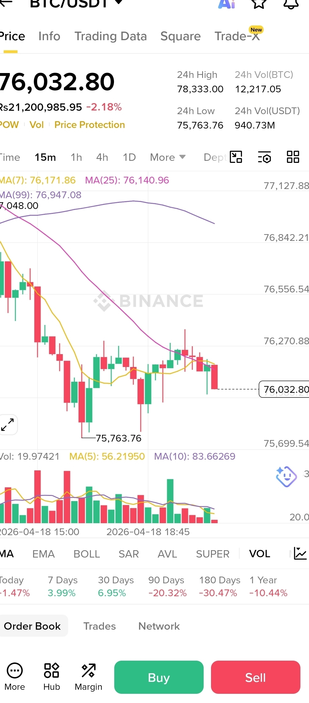Bitcoin is currently trading around $76,000, showing a slight short-term bearish trend on the 15-minute chart. The price recently tested support near $75,700, while moving averages (MA7 & MA25) indicate continued downward pressure. Volume remains steady, but strong buying momentum is not yet visible.