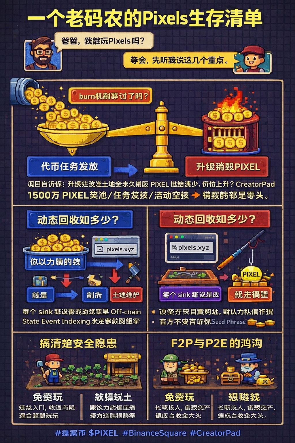 项目方告诉你:升级工具、改善土地,PIXEL会被永久销毁,supply减少,价格上升。听起来很干净。但我翻完白皮书后的第一个问题是:burn rate vs emission rate,到底谁快? CreatorPad这次15M PIXEL的奖池,加上日常任务发放、土地收益、活动空投——销毁的那点零头,在净通胀面前就是营销装饰。