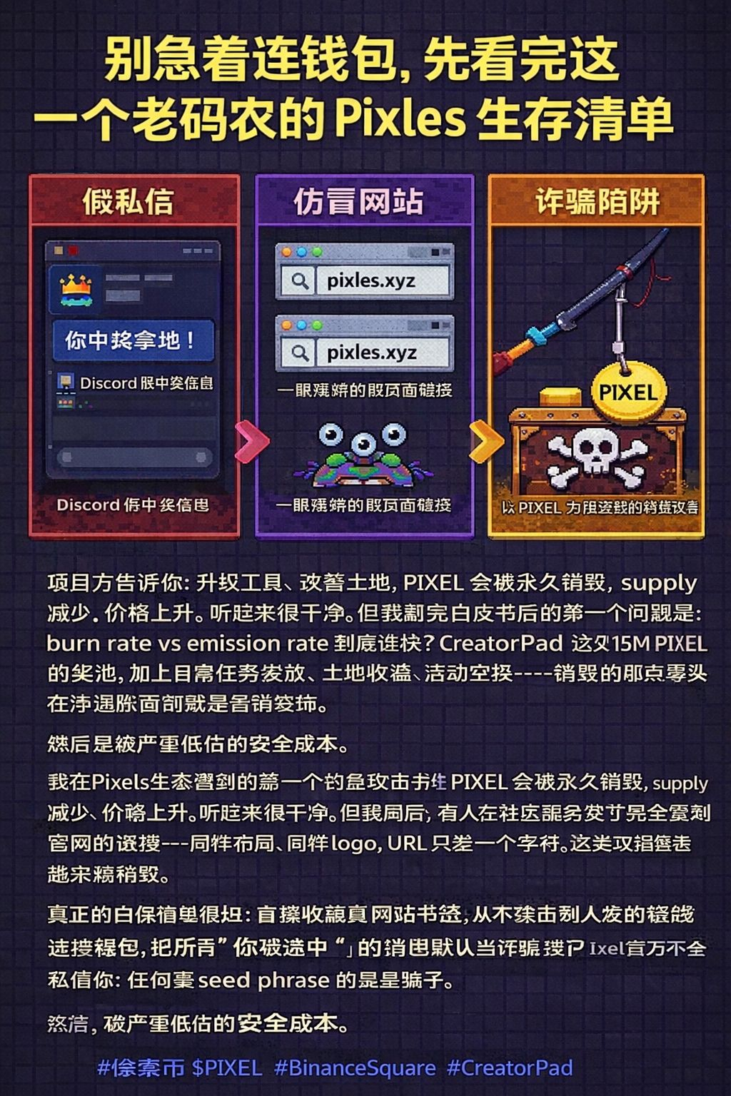 真正的自保清单很短:直接收藏真网站书签;从不点击别人发的链接连接钱包;把所有"你被选中了"的消息默认当诈骗;Pixels官方不会私信你;任何要seed phrase的都是骗子。就这些。没有更复杂的技巧。