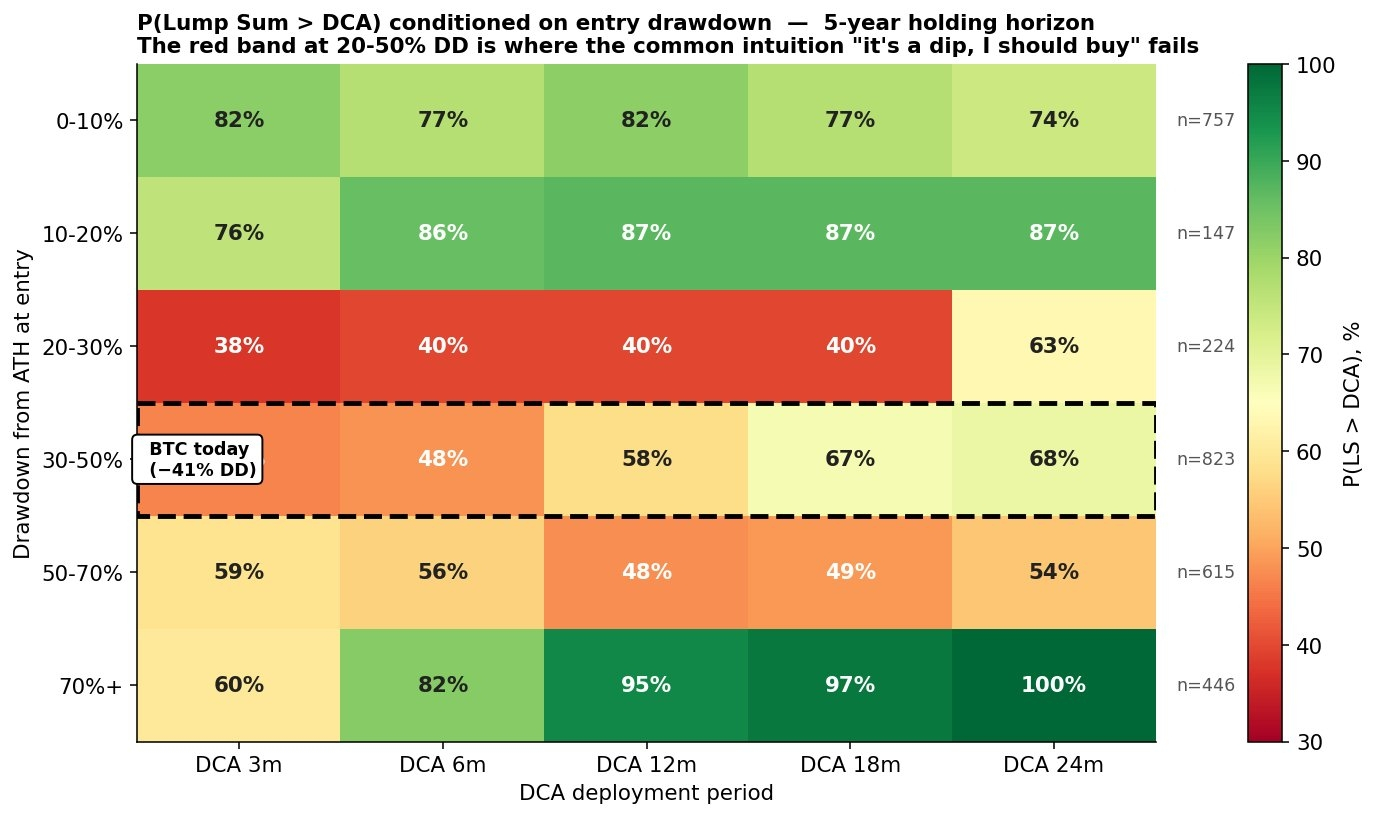 BTC żyje w strefie rzutu monetą częściej niż gdziekolwiek indziej. Pasmo spadków, w którym suma jednorazowa jest aktywnie gorsza niż DCA, nie jest rzadkim przypadkiem skrajnym – to stan modalny danego aktywa.