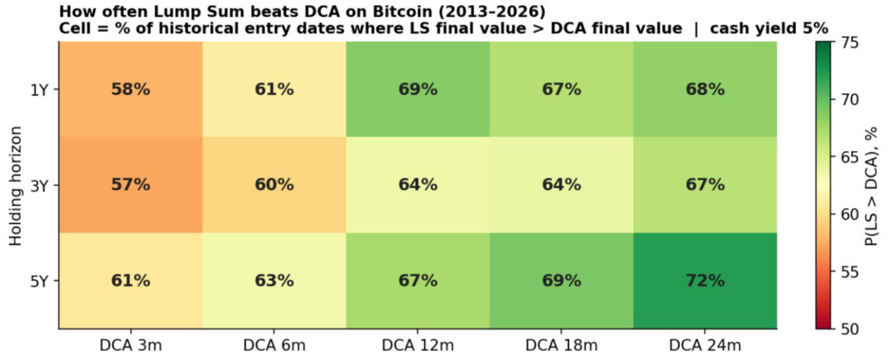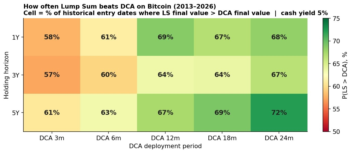 LS pokonuje DCA w 58-72% wszystkich historycznych dat wejścia, w każdym horyzoncie czasowym i przy każdej długości DCA. Dłuższe okresy DCA częściej przynoszą straty — ponieważ dłuższy czas w gotówce oznacza większą utratę oczekiwanego zwrotu.