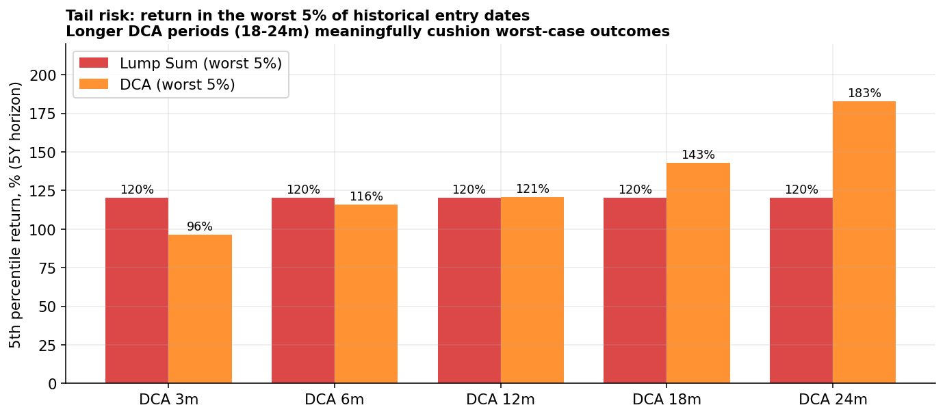 2.) DCA 24m znacząco amortyzuje najgorszy scenariusz — +183% w porównaniu z +120% w przypadku LS. W krótszych horyzontach (1-2 lata) różnica jest większa, a DCA zapewnia rzeczywistą ochronę. W przypadku 5 lat i powyżej różnica się zmniejsza.