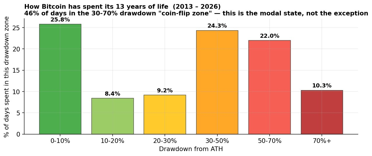 Większość ludzi zakłada, że BTC spędza większość swojego życia w pobliżu ATH. To nieprawda.