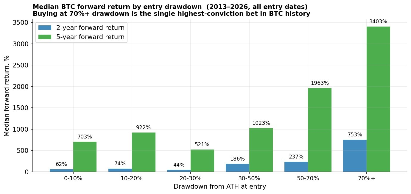 Cena BTC na poziomie 78 tys. dolarów to -37% od ATH z października 2025 roku, wynoszącego 126 tys. dolarów. To najgorszy moment na jednorazowe zakupy w całej historii BTC. Intuicja każdego kupującego podpowiada: „40% zniżki, cofnij ciężarówkę”. Dane wskazują: w mniej więcej połowie przypadków ciężarówka zostaje spłaszczona przez drugą nogę.