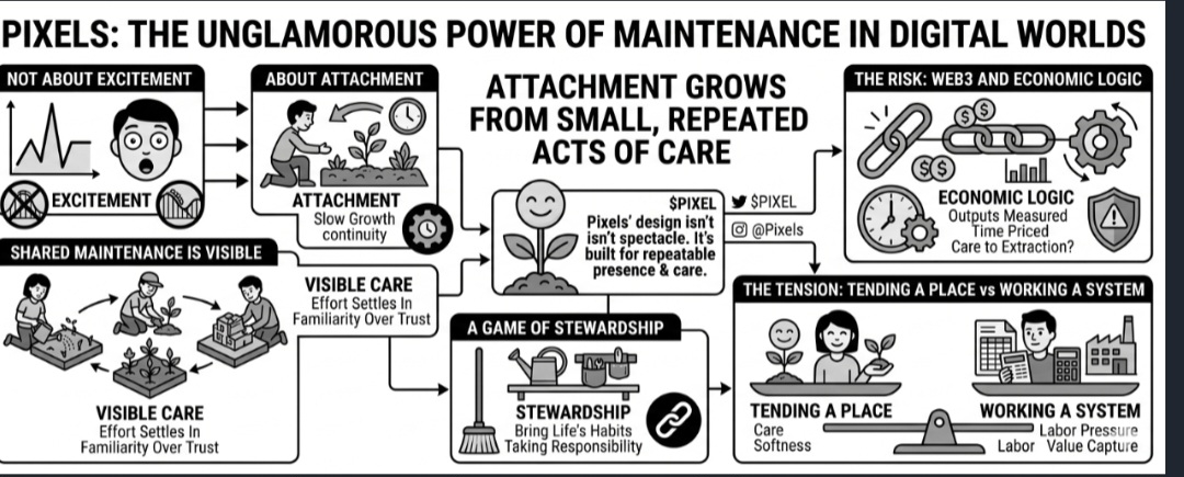That edge is not unique to games, really. It shows up in a lot of digital life now. Platforms want regularity from us. Apps want maintenance from us. Systems want us checking, updating, returning, staying in rhythm with their logic. What a game like Pixels does, at its best, is make that pattern feel gentler and more visible. It turns maintenance into something you can actually see, inhabit, and maybe even enjoy for a while.
