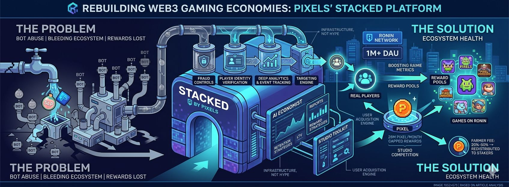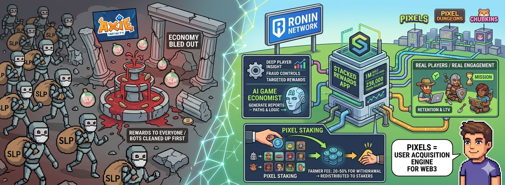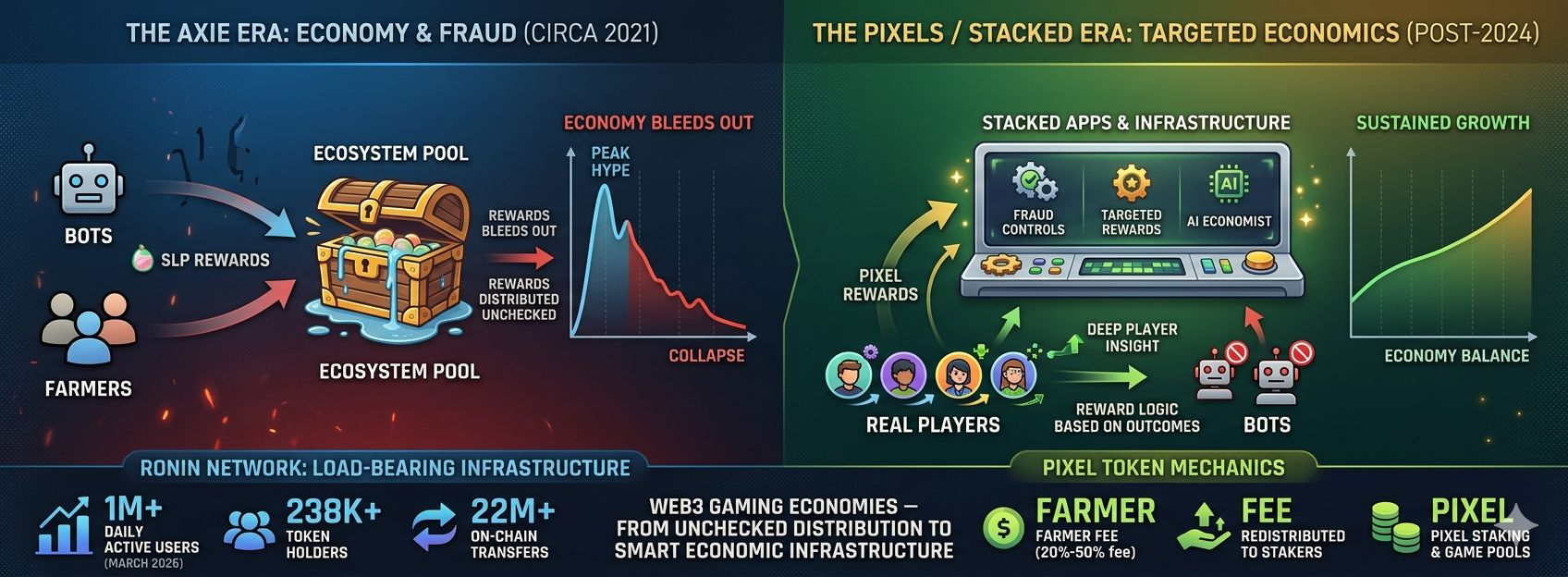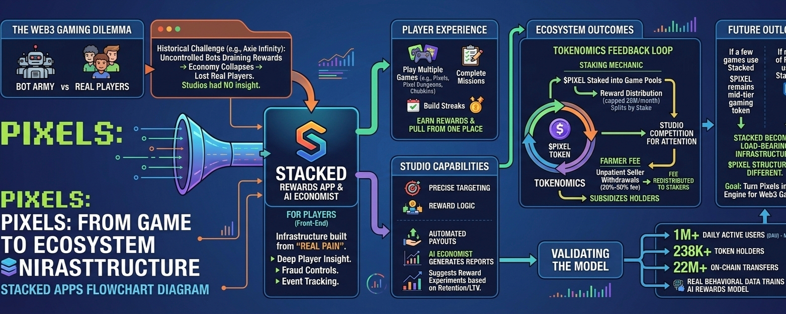 Pixels crossed 1 million daily active users in March 2026. And there are over 238,000 token holders and 22 million on-chain transfers recorded. Those numbers matter for Stacked specifically because the AI economist needs real behavioral data to be useful. You cannot train a rewards model on a ghost town. Pixels has the user base to make the tooling actually work.