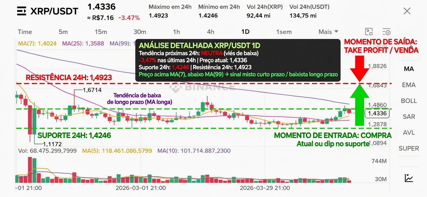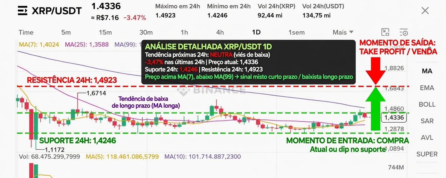 - Preço atual: 1,4336 USDT (-3,47% em 24h).