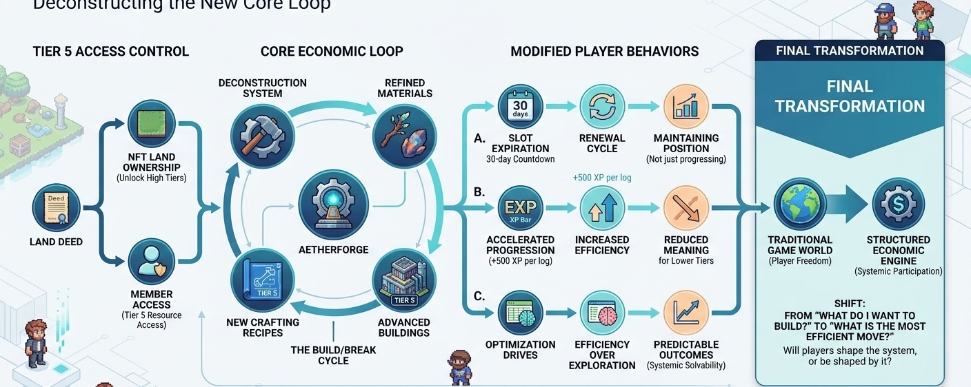Resources like Aether Twig or Aetherforge Ore don’t just appear—they come from deconstruction. That means materials circulate instead of being artificially limited.