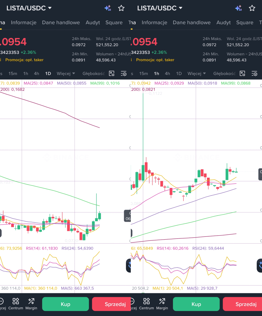 Na interwale godzinnym (1H) obserwujemy lokalną strukturę wzrostową, wspieraną przez dynamicznie rosnące średnie, które działają obecnie jako natychmiastowe wsparcie. Scenariusz A zakłada kontynuację rajdu po udanym reteście poziomu 0,0940 USD, celując w okolice 0,11 USD. Scenariusz B przewiduje chwilowe schłodzenie wskaźników i powrót do bazy przy 0,0880 USD, jeśli wolumen nie utrzyma obecnej dynamiki. Scenariusz C, najbardziej optymistyczny, to gwałtowne wybicie ponad lokalny szczyt 0,1122 USD, co potwierdziłoby formację odwróconej głowy z ramionami na niższych interwałach. Główne ryzyko to nagły spadek płynności na parze USDC, który mógłby doprowadzić do retestu dołków w okolicach 0,0720 USD.
