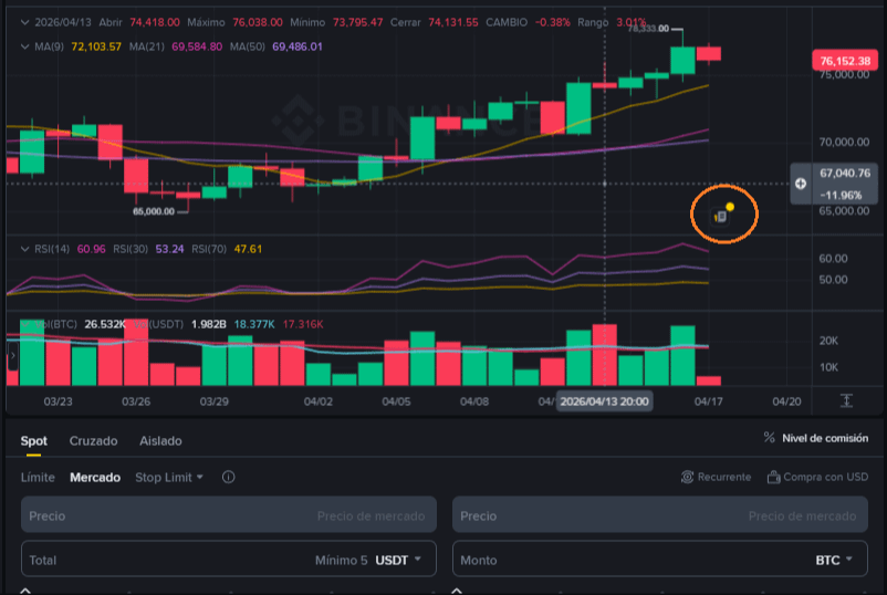 En el panel de gráficos de Trading Spot, hay un Icono dentro de un círculo color naranja.