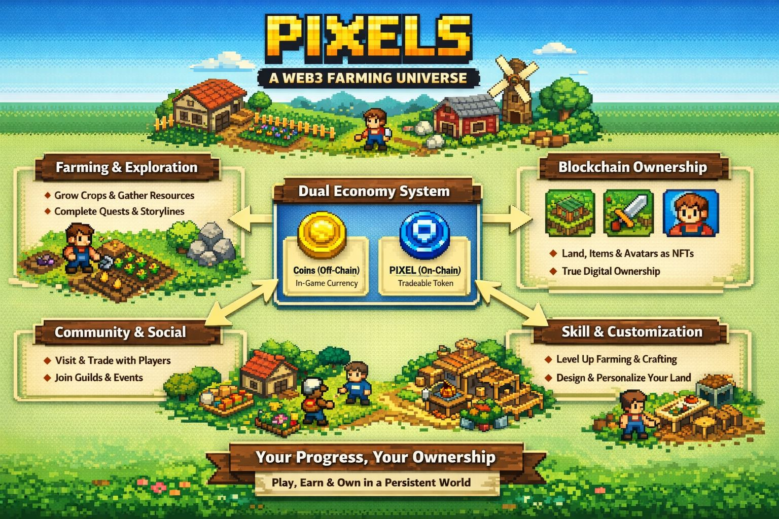 Pixels is more than just a farming game—it’s a persistent digital world where gameplay, creativity, and ownership intersect. By combining familiar mechanics like farming and crafting with blockchain-based asset ownership, it offers a unique experience that empowers players to shape both their journey and their rewards.