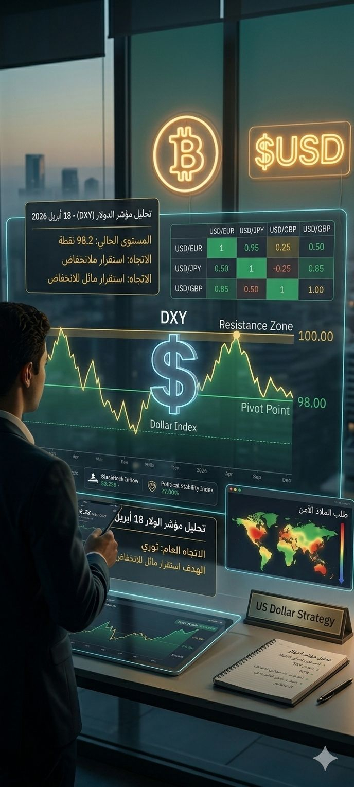 تحليل الدولار الأمريكي (USD) اليوم، السبت 18 أبريل 2026، يظهر حالة من الاستقرار المائل للانخفاض الطفيف بعد فترة من التقلبات القوية. إليك التفاصيل الفنية والأساسية بناءً على أحدث بيانات السوق: