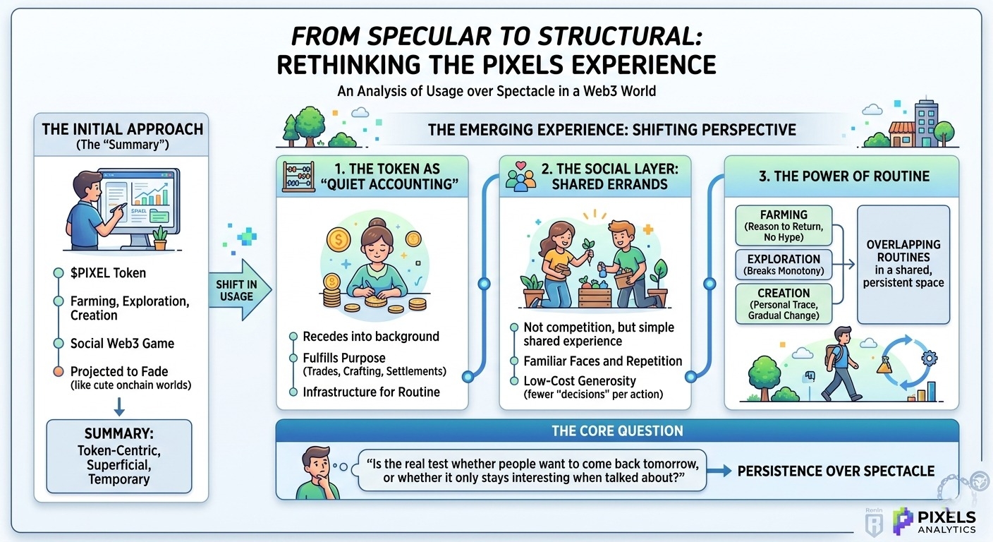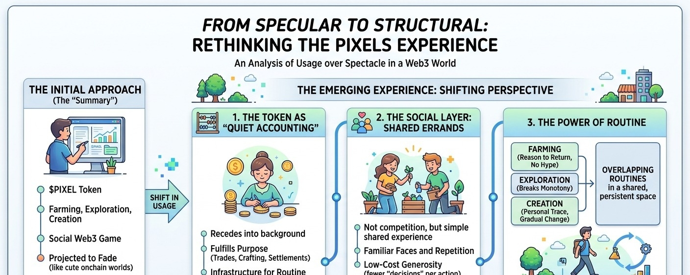 And that difference matters, I think, because Web3 projects often compete for visibility. They are designed to be explained quickly, summarized loudly, and remembered through moments that travel well. Pixels feels like it’s more interested in usage that doesn’t need a spotlight. The infrastructure fades from thought, the token doesn’t constantly interrupt the mood, and what remains is whether the space can hold you when you’re not looking for a spectacle.