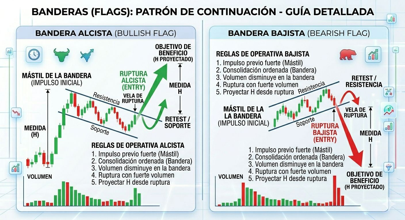 Son pequeñas consolidaciones en contra de la tendencia tras un movimiento explosivo (el "mástil"). Son extremadamente fiables en mercados con mucho momentum.