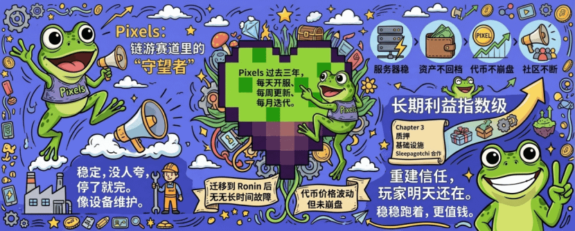 稳定这件事在生意上有个特点,它的好处是慢慢体现的。一个不稳定的项目每次出事都要花精力挽回流失的用户,而一个稳定的项目可以把同样的精力投入到新功能开发和新用户获取上,长期下来两者的差距是指数级的。Pixels在2025年能推出Chapter 3、$PIXEL 质押系统、Stacked基础设施、Sleepagotchi合作,这些新动作能连续落地的前提是老系统在稳定运转,如果团队的一半精力都在修老系统的问题,新功能根本排不上号。