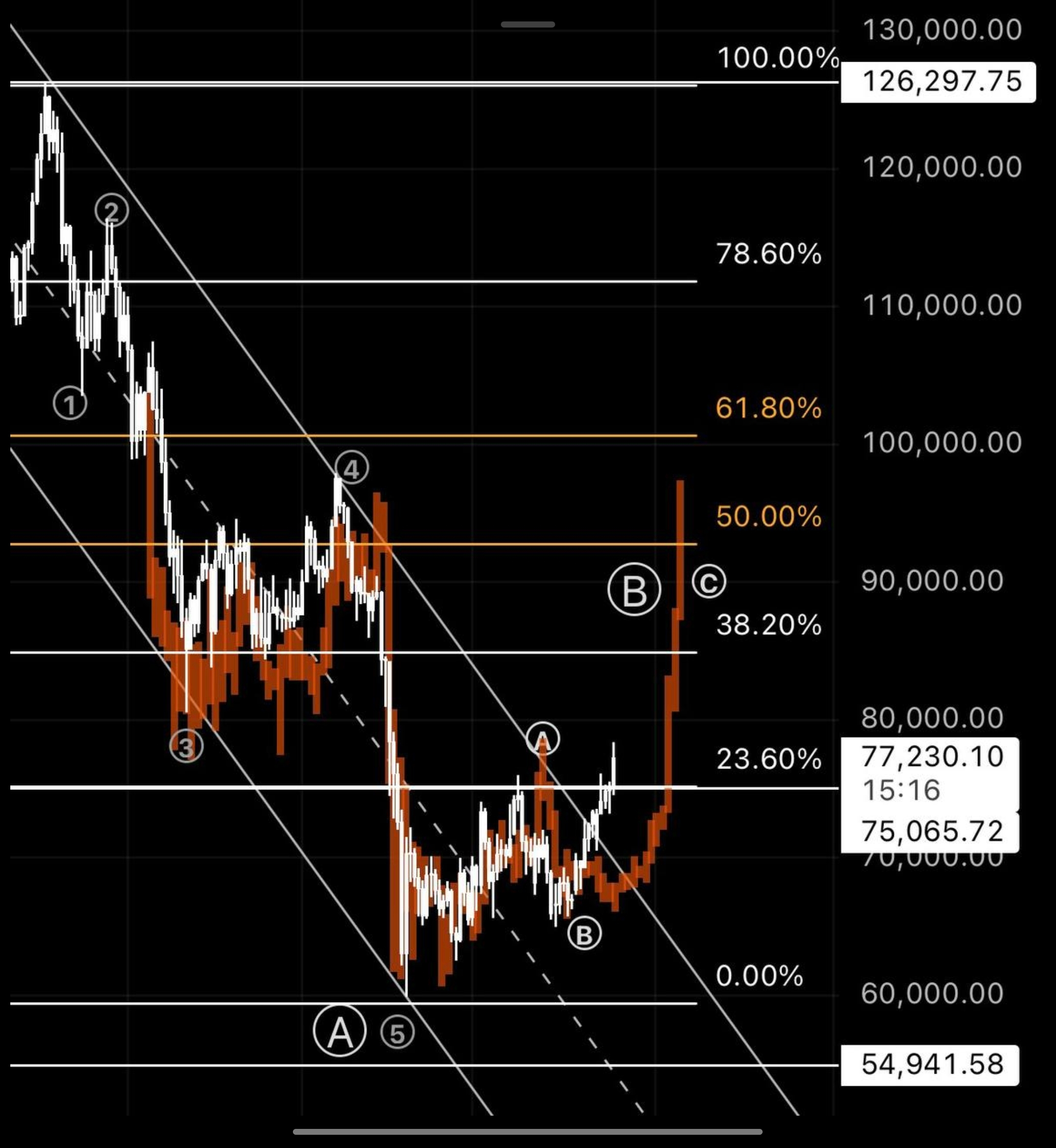 أولاً: قناة هابطة رئيسية امتدت من قمة أكتوبر عند 126 ألفاً، وقد شهدنا اختراقاً لها لأول مرة منذ تشكيلها، وهو إشارة قوية على تغير الوتيرة.