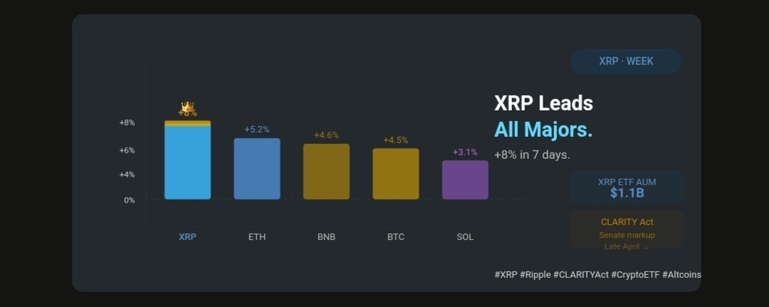 So what's actually driving this? It's a confluence of three things.First, ETF flows are real and growing. Weekly net inflows into US spot XRP ETFs total $41.64 million as of now, while total assets under management in these funds have stabilized above $1.1 billion. SkaddenThat's a meaningful institutional base for an asset that didn't even have a spot ETF eighteen months ago.Second, the legal overhang is nearly gone. The SEC dropped its appeal of the Ripple case in 2025, and the CLARITY Act's Senate Banking Committee markup — expected in the final two weeks of April — is likely to formally classify XRP as a digital commodity rather than a security. A decision from the Senate committee regarding the CLARITY Act bill, expected in late April, is likely to provide final clarity on XRP's legal status, which could become a trigger for outperformance.