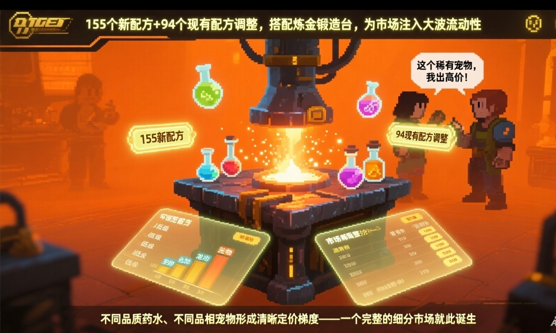 我查到他这次这个更新还带来了155个新配方和94个现有配方的调整,可以说非常的详细,搭配着这次新引入的炼金锻造台,感觉他等于给市场注入了一大波流动性。不同品质的药水、对应不同品相的宠物,明显的可以在市场上有了清晰的定价梯度,你看吧一个完整的细分市场就这么形成了。
