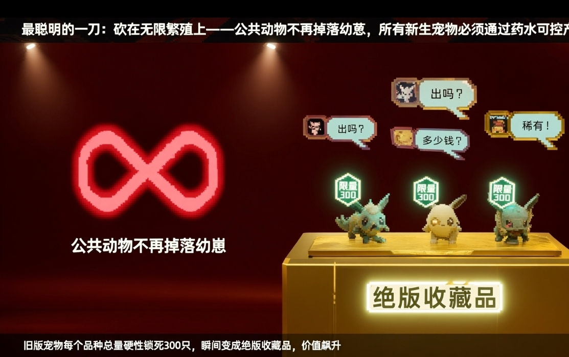我觉得项目游戏这次更新里最聪明的一刀,可以说砍在大动脉上,就是它的无限繁殖上边了。可以明显看到现在公共动物(Public Animals)不再也不能掉落幼崽了,现在的想获得新生宠物的话,所有新生宠物都必须通过孵化药水才能进行可控产出。我觉得这就把以前的佛系生崽彻底堵死了,以前新宠物随便能就生,随处可见,现在你如果还想要的话必须主动投入资源。就像我之前说过的我觉得更狠的是,旧版宠物每个品种的总量被硬性锁死在300只。感觉这个上限一出来,那些以前老玩家手里的那些宠物们瞬间变成了绝版收藏品,只要群里有人晒出来有这个东西,底下跟帖全是出吗我想买等等回复,稀有感和直接拉满,价值也提升了非常多。