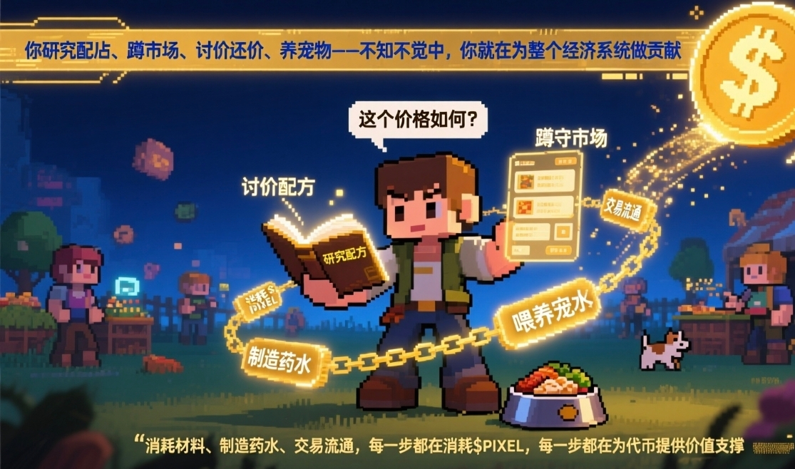 我觉得还有一个比较精妙的地方,这套系统保持了趣味性的同时,又让玩和赚钱自然融合起来了。你如果想养出高阶宠物,你得研究配方把、你的研究市场需求吧、你还要和人讨价还价,你要估花时间去养他;其实在这个过程中,你已经不知不觉就在为整个经济系统做贡献了,消耗材料、制造药水、交易流通。你要做的每一个环节每一步都在消耗$PIXEL,每一步都在为代币提供价值支撑,你是参与者也是贡献者。