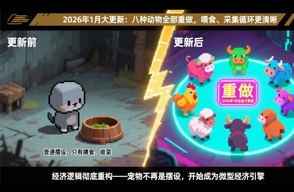 我个人认为2026年1月分的那次全盘的大更新,是项目游戏的宠物系统真正脱胎换骨的核心转折点。在这次更新之前,我觉得项目里边的宠物更像是个很普通的摆设,只有喂食、收菜这些项目,存在感不是很高。但这次全盘的更新把八种动物全部重做了,我们可以明显看到喂食、采集的日常循环被梳理得更清晰,我觉得最关键的是,项目游戏里边经济逻辑也被彻底重构了。