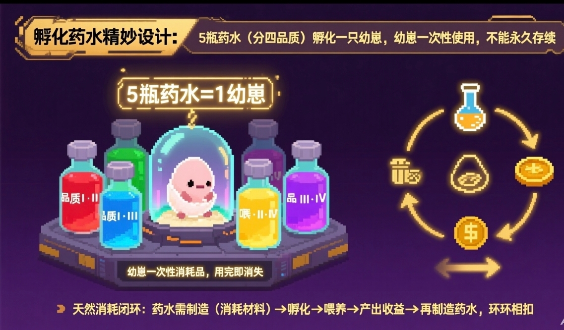 另外的话我感觉项目里边这次孵化药水的设计更是非常的巧妙。你如果想孵化一只幼崽,必须要需要5瓶药水注意少一瓶都不行,另外的话关键点在于药水本身还分了四个品质等级,这就明显的把层次感拉开了。我感觉更关键的是,这些幼崽是一次性消耗品,不是永久资产,孵化出来用完了就没了不能去重复的用。我感觉这就形成了一个天然的完美的消耗闭环,你需要的药水需要通过制造系统生产,制造它制造要消耗材料,孵化出来你还得还得继续喂养。项目里边这个整个的流程环环相扣,没有一步是多余的,直接把幼崽这块盘活了。