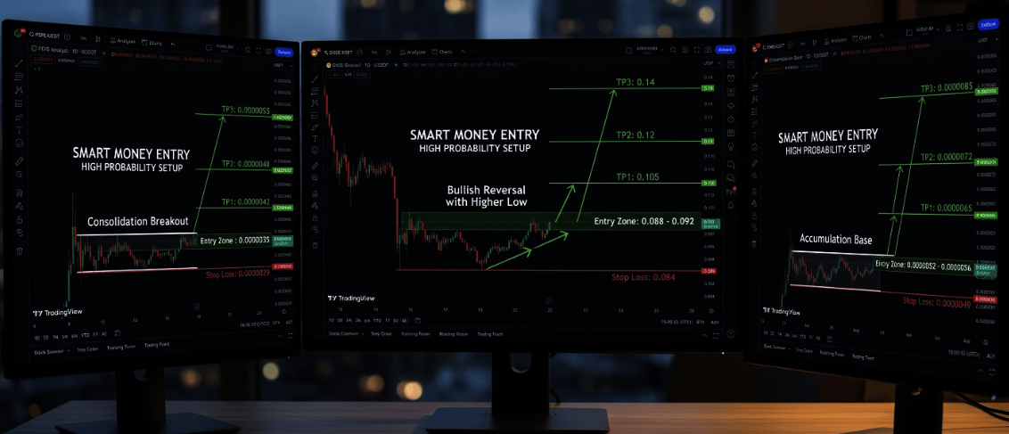 Saat ini market sedang berada dalam transisi dari Early Accumulation menuju Breakout Trigger Phase. Mari kita bedah setup teknikal untuk tiga raksasa meme: DOGE , PEPE , dan SHIB.