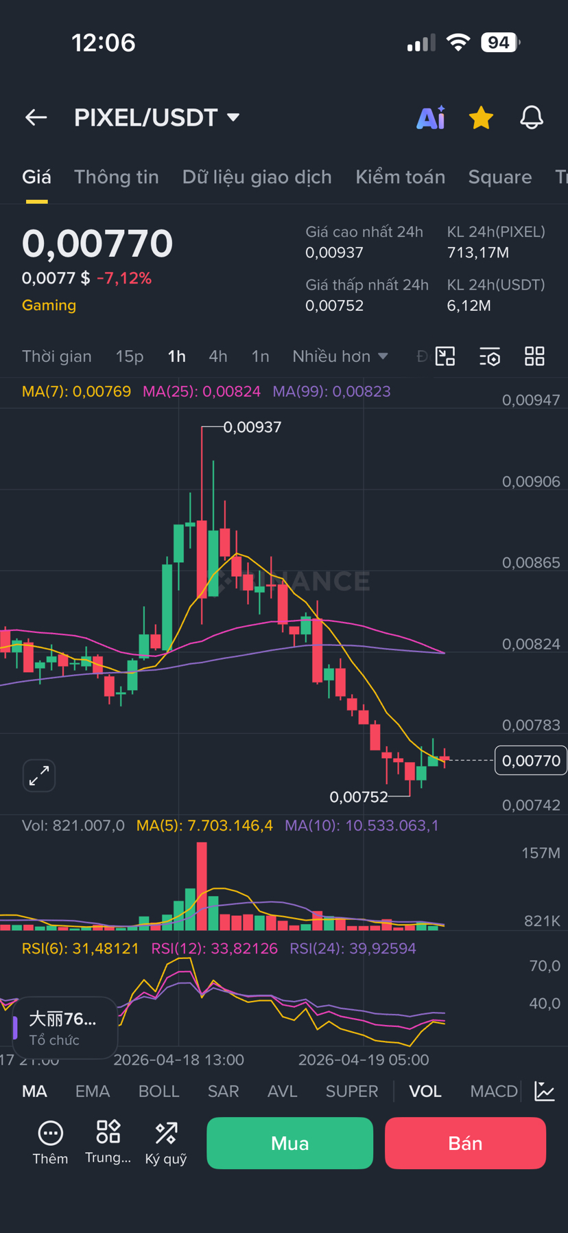 PIXEL hiện giao dịch ở mức 0,00770 USDT, giảm mạnh 7,12% trong 24h. Token đã điều chỉnh sâu từ đỉnh 0,00937 xuống vùng thấp 0,00752, rơi vào giai đoạn pullback rõ rệt sau nhịp tăng trước đó.