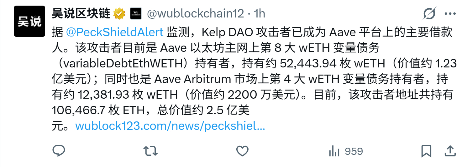 作为币圈一员的我们现在最关注的不是这 2.92 亿能不能追回来,而是后面谁来接这个风险。跨链、再质押、借贷,链条越长,薄弱点越多。今天是 Kelp,明天可能就是别的协议。市场爱讲创新,但安全这门课,永远是最贵、也最容易被忽略的那一门。#Kelp DAO遭攻击 #山寨币复苏? $AAVE