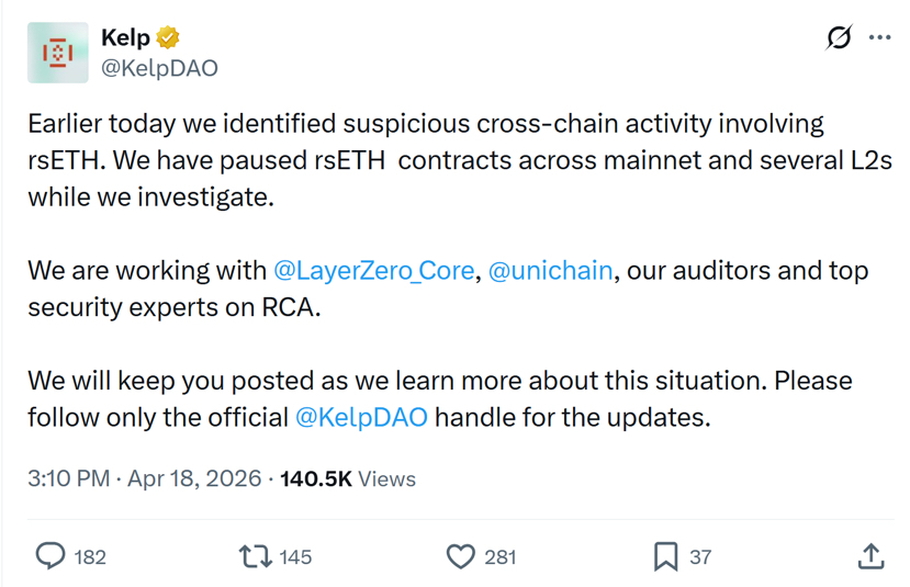我看完第一反应不是“又被黑了”,而是:这类桥,真是 DeFi 里最容易被放大成灾难的地方。因为一旦消息验证链路出问题,资产不是“丢一点”,而是可能整包被拖走。 这次 Kelp 也算反应快,马上暂停主网和多条 L2 上的 rsETH 合约,拉着 LayerZero、Unichain 和安全团队一起查根因。