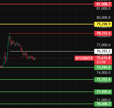 BTC dzisiaj zwraca uwagę na 76350 ten poziom, tylko jeśli stanie stabilnie powyżej tego poziomu, ta fala korekty będzie uznawana za zakończoną, najpierw patrz na poprzedni szczyt 78320, ten poziom mocno się nie przebił, mały poziom nadal spadnie, tylko mocno przełamać w górę w okolice 79300-81500-83000 czekając na pozycje krótkie!