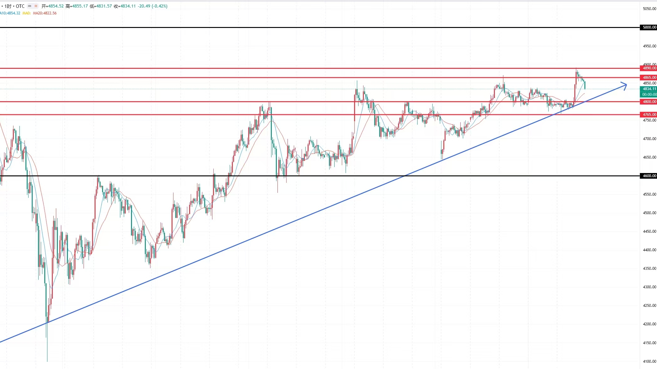 从盘面来看,周线级别上,黄金整体还是震荡偏强的走势,连续好几周收阳线,均线都是向上排列,金价稳稳站在5周、20周均线上方,均线形成了有效支撑。MACD指标在零轴上方运行,红色柱子小幅缩量,多头力量还在,整体低点和高点都在慢慢抬高,下方4600附近是强力支撑,上方压力主要看4950-5000这个区间。日线级别上,金价多次回踩4765-4785这个关键支撑位都没跌破,支撑很有效,均线也慢慢形成多头排列,5日均线和10日均线交叉向上,MACD在零轴上方,红色柱子小幅放量,多头力量在不断积累。
