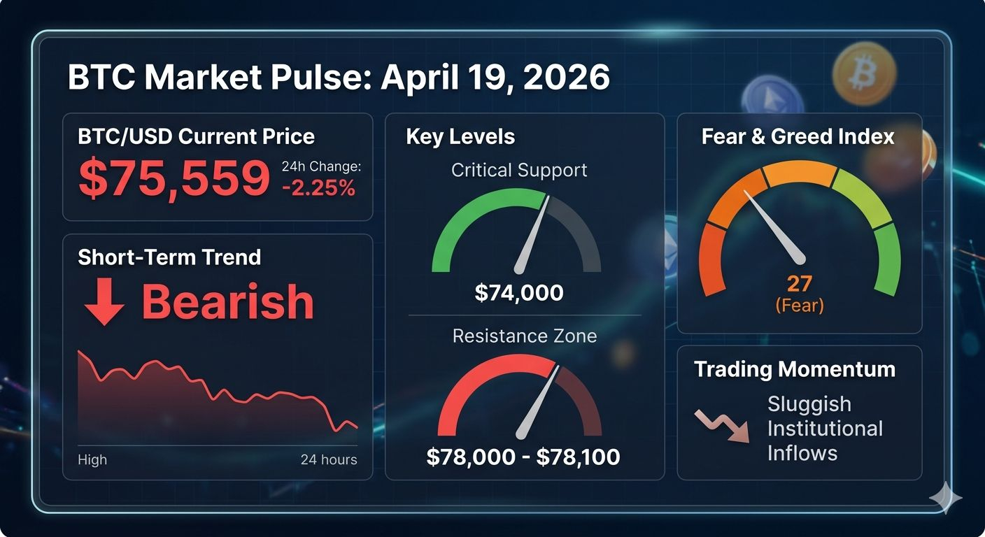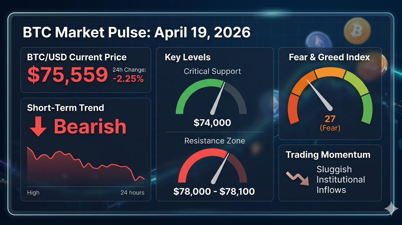$BTC currently navigating a bearish short-term trend, trading around $75,559 with a 2.25% decline over the last 24 hours. The market is facing heavy rejection at the $78,000–$78,100 resistance zone, while the $74,000 level acts as the immediate critical support that must hold to prevent a deeper slide toward $70,500. Trading momentum is sluggish as institutional inflows have cooled, leaving the Fear & Greed Index at 27 (Fear). Overall market sentiment is cautious and apprehensive; traders should watch for a high-volume breakout above $78,100 for a bullish reversal or a daily close below $74,000 as a signal for further consolidation.