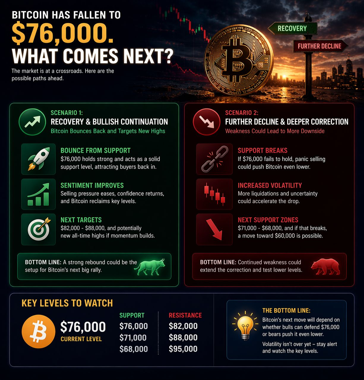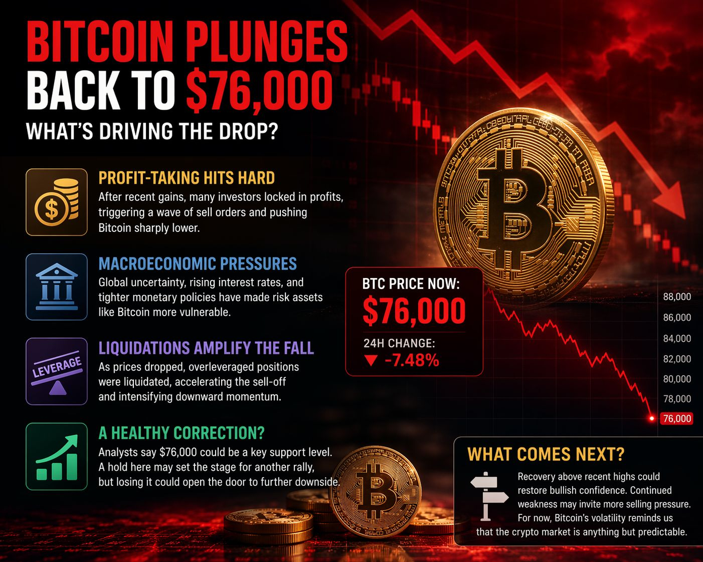 For now, the drop to $76,000 serves as a reminder of Bitcoin’s inherent volatility. Whether this is a brief setback or the start of a larger correction remains to be seen—but one thing is certain: the crypto market is far from predictable.