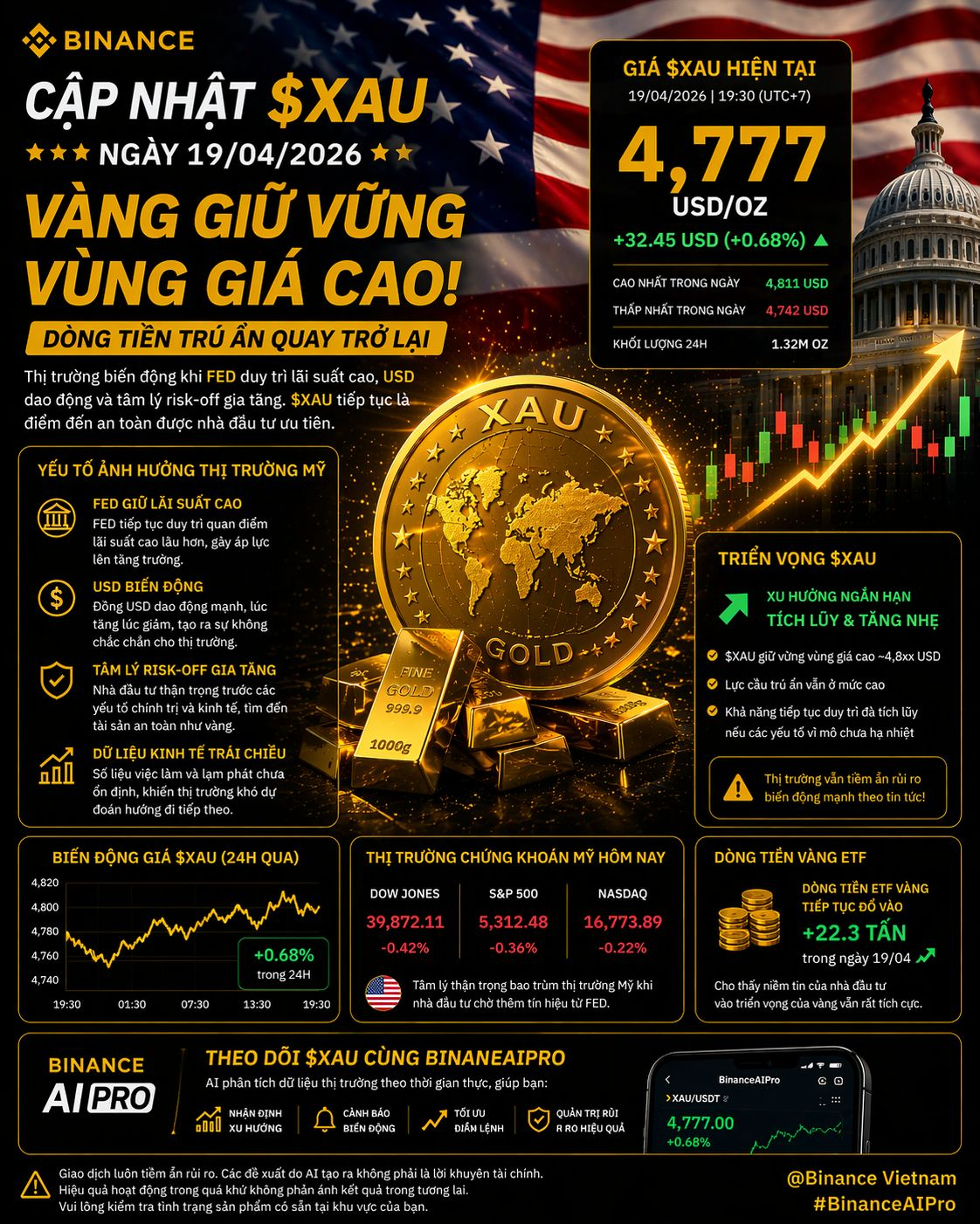 Thị trường ngày 19/04/2026 tiếp tục ghi nhận những biến động đáng chú ý khi $XAU duy trì vùng giá cao quanh mốc 4,8xx USD, cho thấy lực cầu đối với tài sản trú ẩn vẫn đang khá mạnh. Dù có những nhịp điều chỉnh ngắn hạn, xu hướng chung vẫn là tích lũy và phục hồi nhẹ.