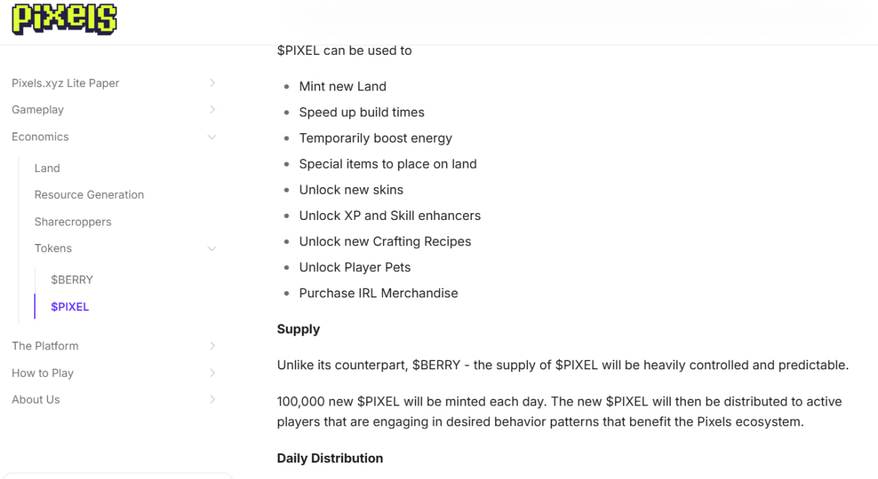 根据Pixels官方Litepaper(litepaper.pixels.xyz),$PIXEL在游戏内承担的核心功能包括:土地相关的经济交互、道具和资源层面的消耗、社区治理投票权。