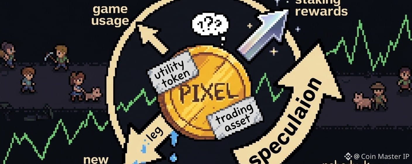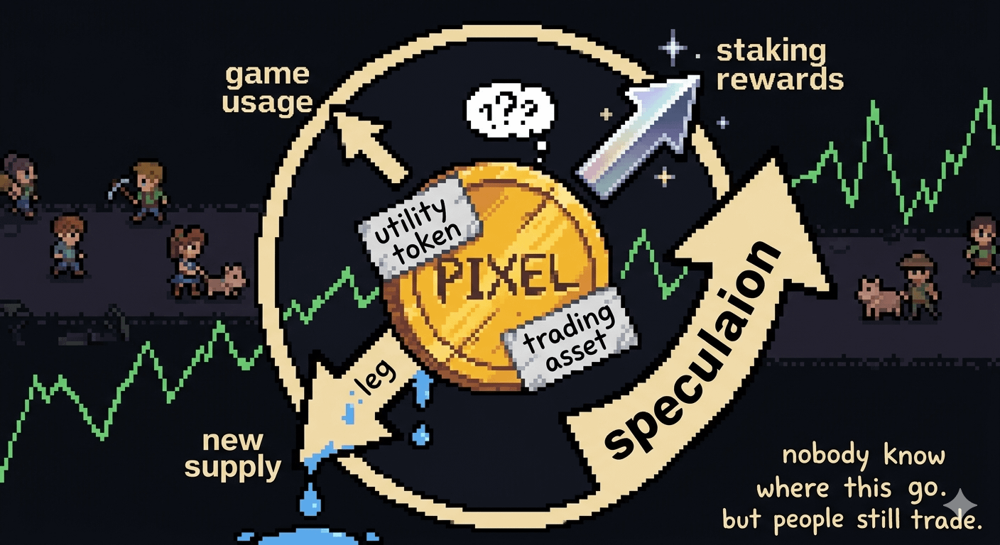 PiXeL token from Pixels game sound like it should be super important for play, rIght? But nomost game you no need PiXeL at all. So not like… must have to playWhere PiXeL matter? Only inside ecosystem. But not the alll ecosystem—just few position insIde ecosystem got reel use. Basic gameplay? No need PiXeL. So demand not come from everybody playing Demand come from small part inside ecosystem where people actually use it.