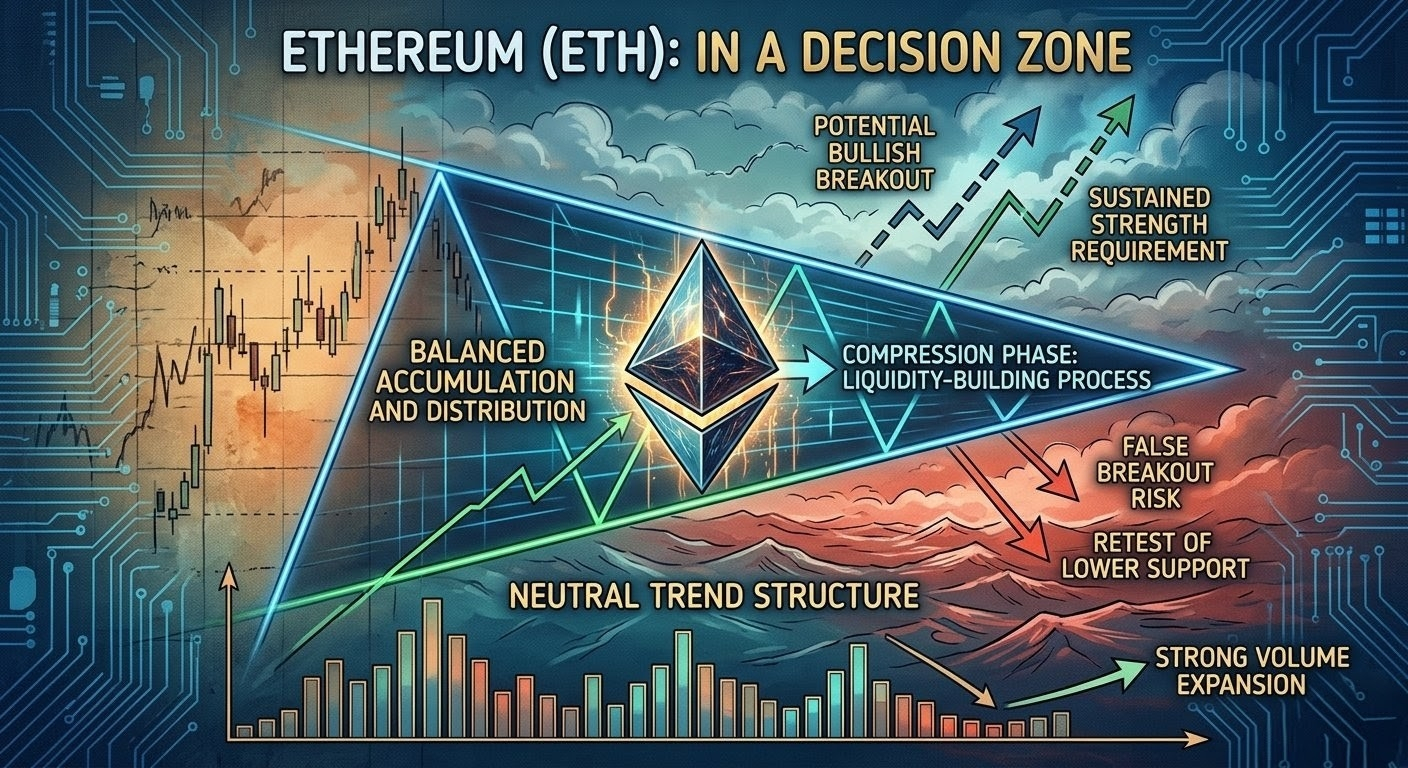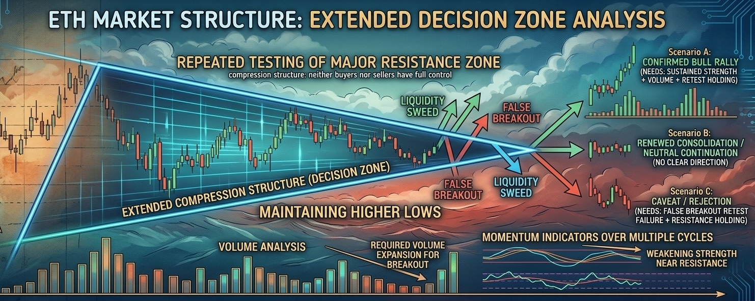 Ethereum (ETH) is currently in a key market phase where price is consolidating after a prolonged period of volatility. On higher timeframes, ETH is moving inside a compression structure where neither buyers nor sellers have full control. This type of structure often appears before large directional moves, but it does not guarantee the direction of the breakout.