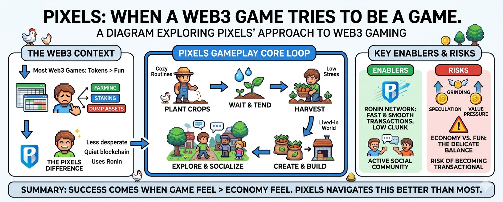 Pixels feels like a game that learned from watching other Web3 games embarrass themselves. It keeps things smaller. Softer. Less pushy. It doesn’t scream at you about ownership or decentralization like those words alone are supposed to carry the whole experience. Good. They shouldn’t. Most players do not care about the ideology. They care if the thing is boring. They care if it breaks. They care if it feels like a scam wrapped in pixel art.