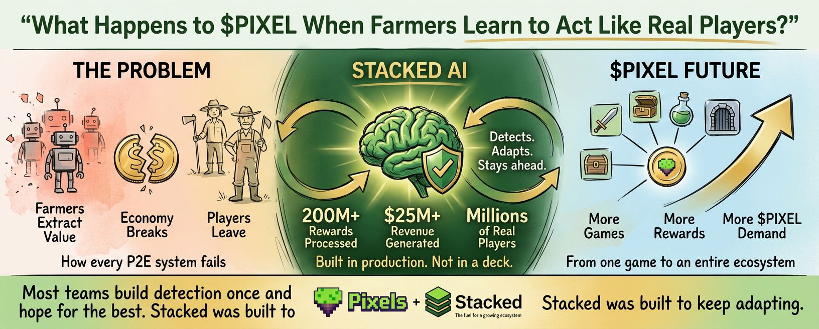 To nie jest koncept. To nie jest biała księga. Już przetworzył ponad 200 milionów nagród wśród milionów prawdziwych graczy. Pomógł wygenerować ponad 25 milionów dolarów przychodu dla ekosystemu Pixels.